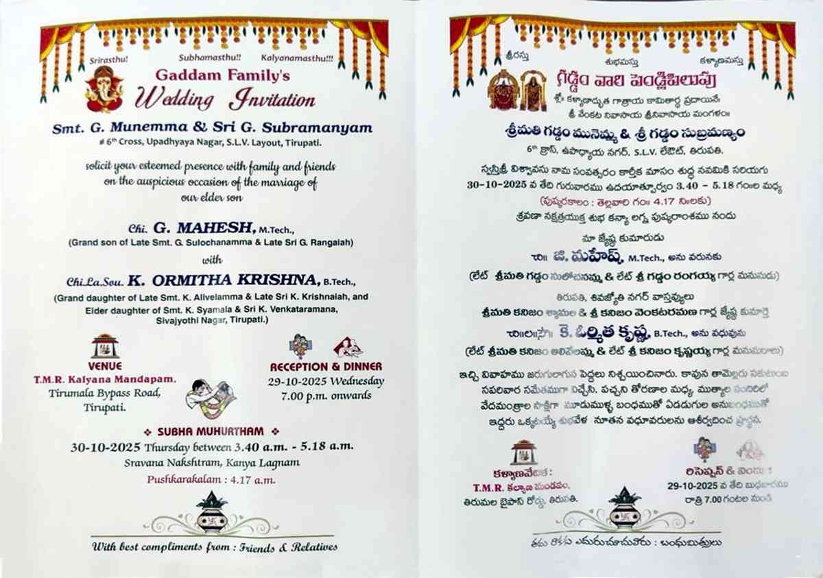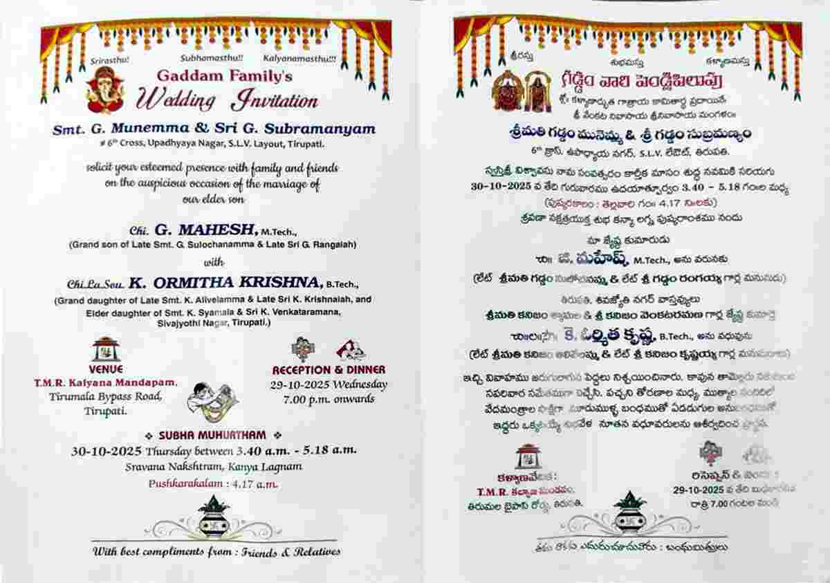 RECEPTION : 29-10-2025, 07:00pm WEDDING : 30-10-2025, 03:40am - 05:18am